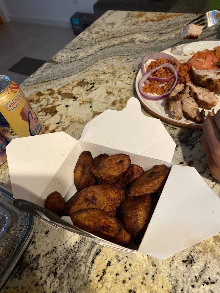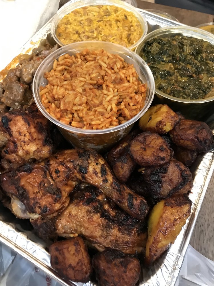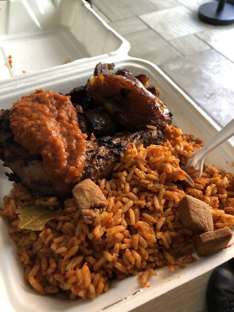 1 pot rice dish with tomatoes, bell peppers, onions, habaneros and several fragrant spices. Served with fried plantains and chargrilled peppered chicken.