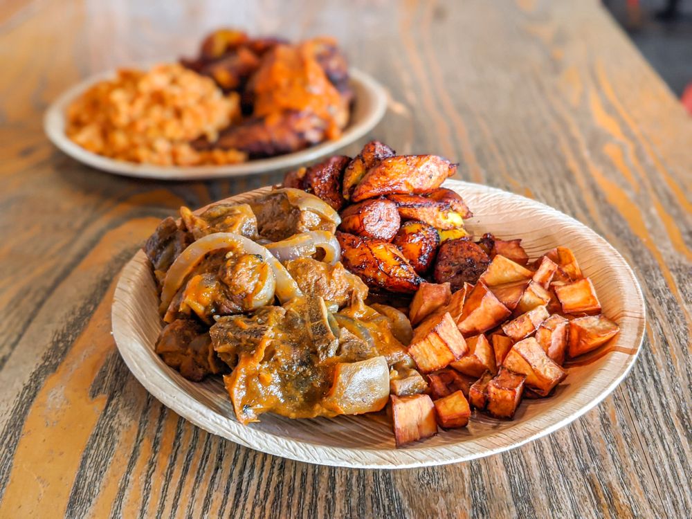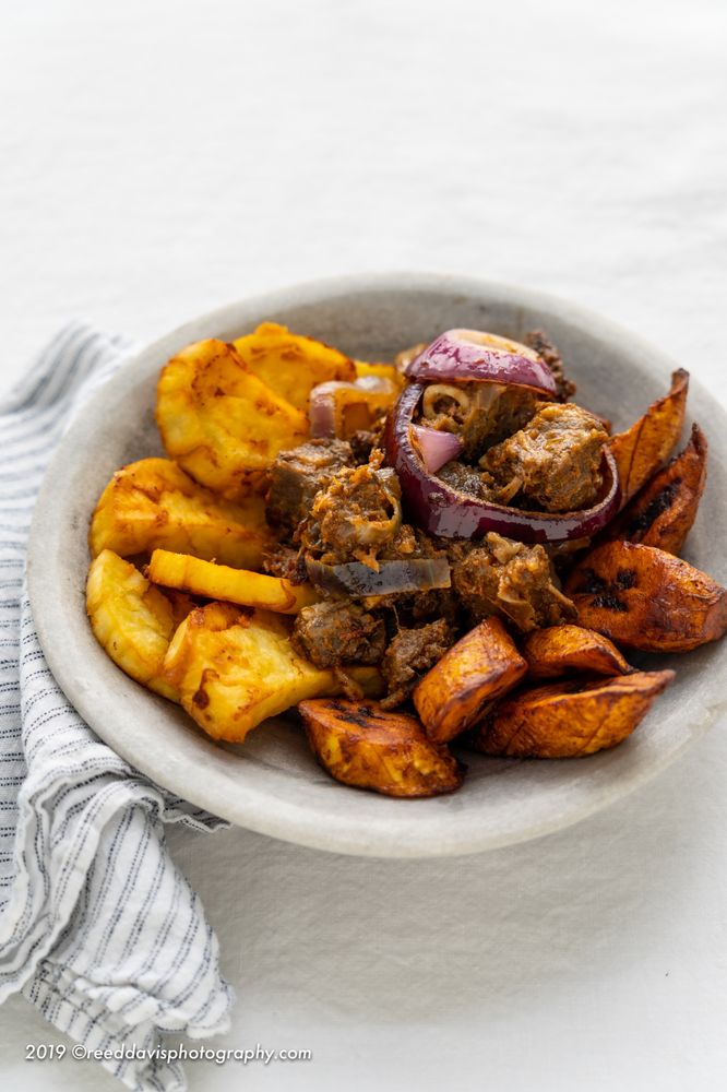 Smoked Goat meat stir fried in a spicy and sweet red pepper and onion sauce, served with fried plantains and sweet potatoes.