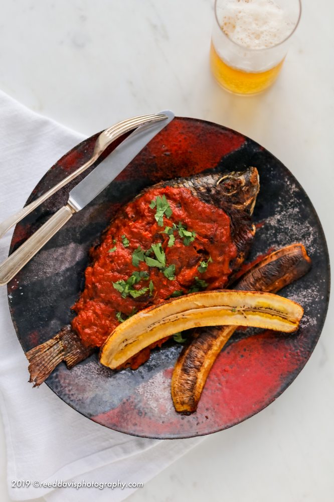 Nigerian honey beans, slow cooked with fresh ginger and onion with a blackened onion and palm oil stew served with fried plantains.