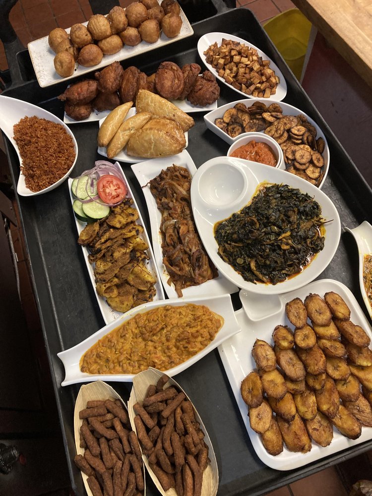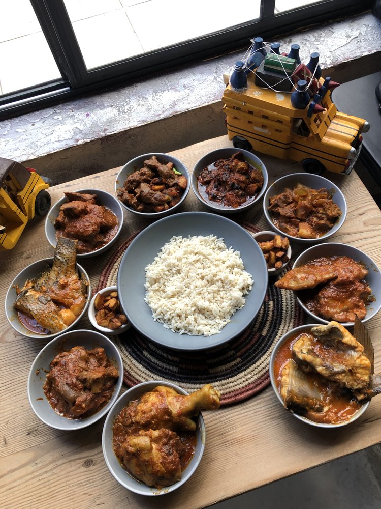 Chicken in spinach and bell pepper, tomato sauce made with palm oil and fermented locust beans. Served with steamed white rice and jollof rice