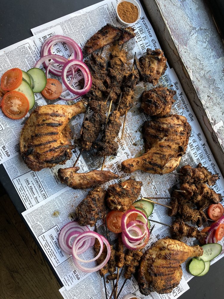 Pick your meat marinated in our house suya spice blend (contains peanuts) and grilled. Served with sliced onions, tomato and cucumber.